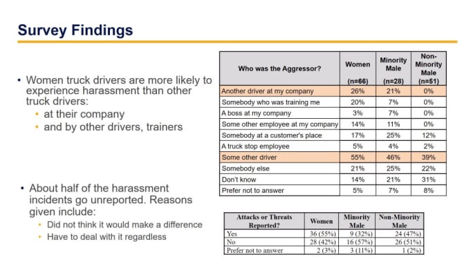 The FMCSA survey found many instances of harassment and threats go unreported. For women drivers, 55% did report the attacks or threats, but 42% did not. Reasons given included that the respondents did not feel it would make a difference, and that they would still have to deal with it regardless.