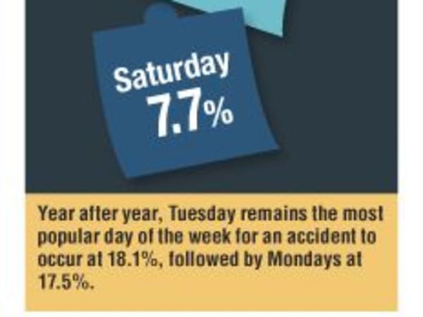 ear after year, Tuesday remains the most popular day of the week for an accident to occur at 18.1%, followed by Mondays at 17.5%.