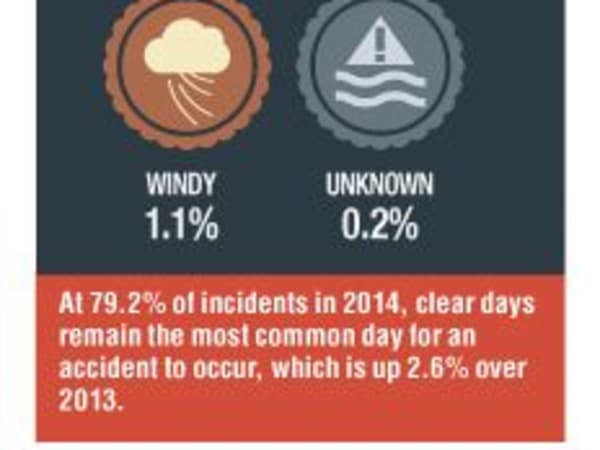 At 79.2% of incidents in 2014, clear days remain the most common day for an accident to occur, which is up 2.6% over 2013.
