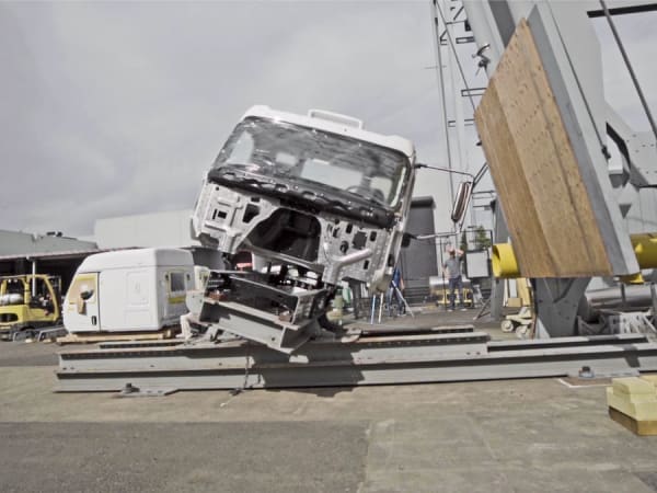 The Western Star 49X was tested at the structures lab at DTNA, including this cab-crush test.