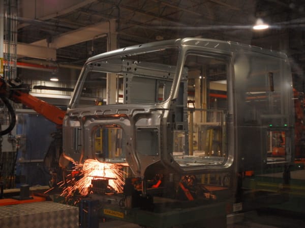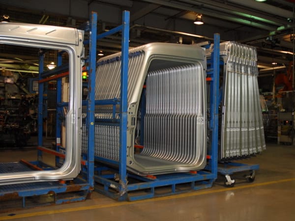 2. The basic cab structure is hand-mounted on a jig and sent into the welding area where to body panels are robotically spot-welded to the subframe of the cab.