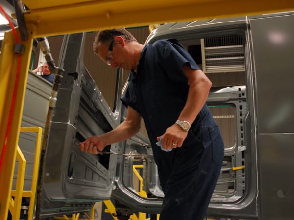 4. After the basic cab is assemble, workers fit up some interior structures and panel before the cab is primed and painted.