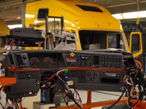 8. Dashboard assemblies that are pre-wired and configured to the customer's specifications are matched to the cab they ordered and installed before the windshield and other bit go in.
