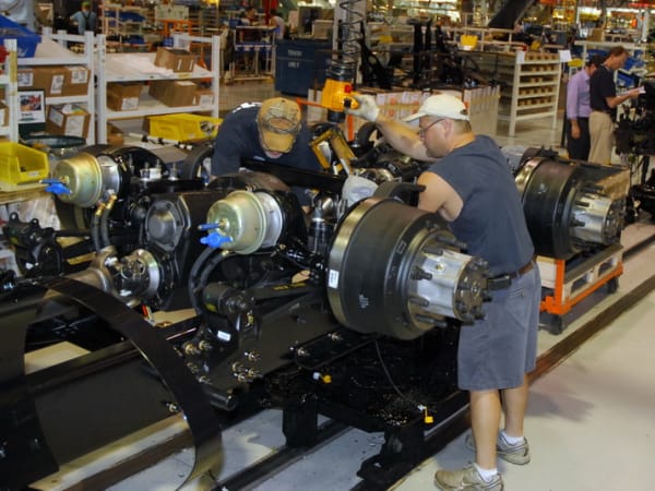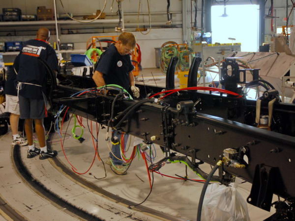 9. Way off in another part of the plant, workers begin assembling the chassis, beginning with a pair of frame rails and a few crossmembers Along the way, air and electrical lines woven into place, frame brackets are installed and the frame is prepped for painting.