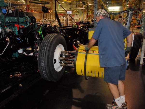 13. Wheels are installed and electronically torqued to the proper tightness by tools that measure torque and record the setting for quality control purposes. Most of the hoisting of heavy parts is done by machine to prevent worker injuries.