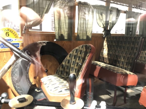 Volvo Bus interior- note spare tire mounted next to driver seat.