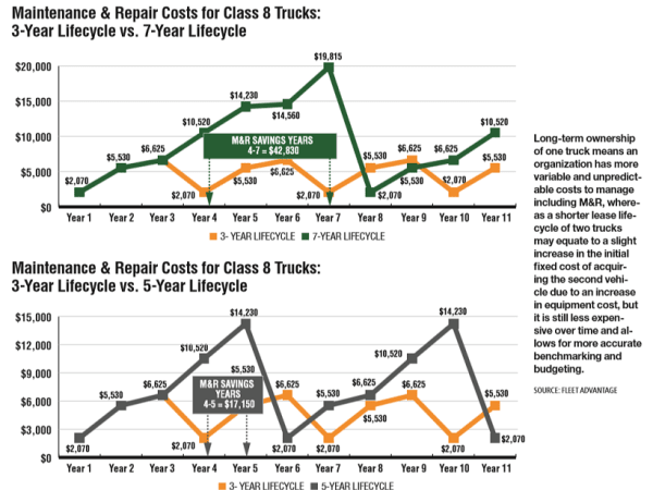 Long-term ownership of one truck means an organization has more variable and unpredictable costs to manage including M&R, whereas a shorter lease lifecycle of two trucks may equate to a slight increase in the initial fixed cost of acquiring the second vehicle due to an increase in equipment cost, but it is still less expensive over time and allows for more accurate benchmarking and budgeting.