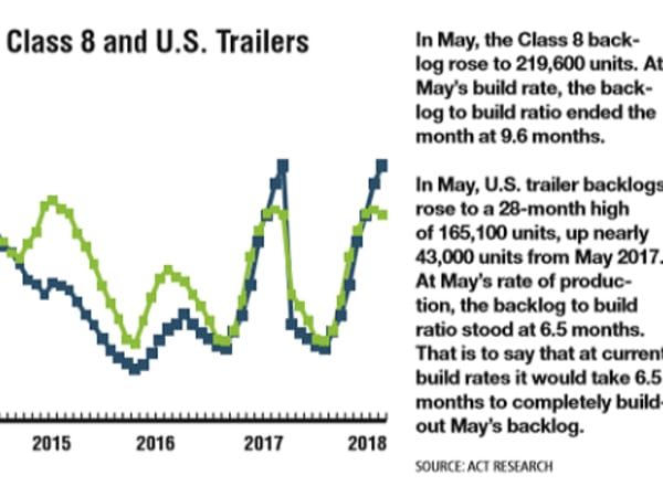In May, the Class 8 backlog rose to 219,600 units. At May’s build rate, the backlog to build ratio ended the month at 9.6 months.
