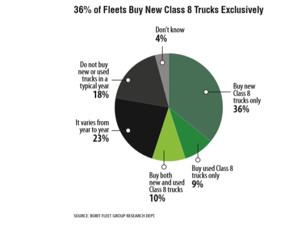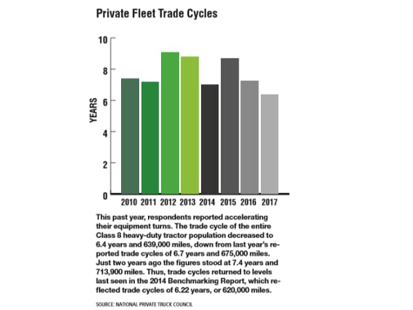 This past year, respondents reported accelerating their equipment turns. The trade cycle of the entire Class 8 heavy-duty tractor population decreased to 6.4 years and 639,000 miles, down from last year’s reported trade cycles of 6.7 years and 675,000 miles.