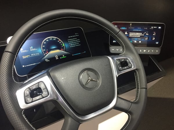 The new driver interface for the Mercedes Benz Actros replaces dials and switches with flat screens.