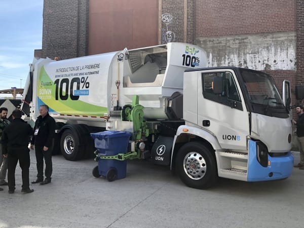 Quebec-based electric truck maker Lion and body builder Boivin Évolution showed off their Class 8 truck with 100% electric powertrain and automated collection hopper.