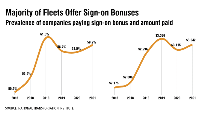 Overall, a majority of fleets offer sign-on bonuses, although neither as many nor as large as two or three years ago, according to the National Transportation Institute, which tracks more than 125 different attributes of pay packages for company truck drivers and owner-operator compensation. The problem is, sign-on bonuses may just cause drivers to chase the next bonus as soon as their minimum time required to collect the bonus is finished. NTI has found that drivers stay longer when they are recruited for the appropriate wage in that market, and pay is accelerated appropriately by tenure, by earnings, and outcomes that are necessary to be recognized in the job, such as safety incentives, fuel incentives, and productivity incentives.