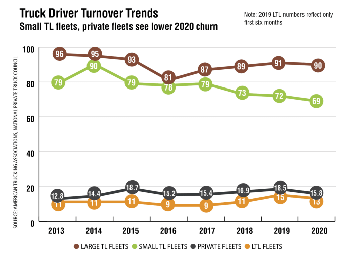 Despite the rollercoaster year that was 2020, the overall driver turnover rate for large truckload carriers was very similar to 2019, according to the American Trucking Associations. Carriers with more than $30 million in annual revenue averaged 90%, down one point from 2019, although it had dipped to 85% for the first six months of 2020. The annual average rate at smaller truckload fleets was 69% in 2020, down from 72% in the previous year.