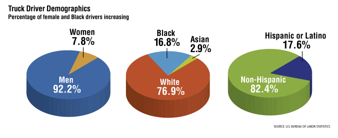 In this Bureau of Labor Statistics 2020 data for “driver/sales workers and truck drivers,” out of 3.36 million total employed, women remain by far the minority. Over the past decade, the percentage of women has risen from 4.6% in 2010, and the percentage of Black drivers has risen from 13.6% a decade ago. The percentage of Asian and Hispanic/Latino drivers has remained about the same.