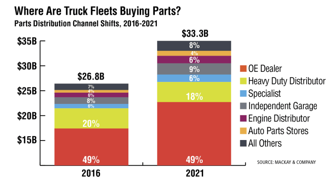 In the last five years, aftermarket parts demand for medium- and heavy-duty vehicles (Class 6-8), trailers and container chassis has grown 25%. The heavy-duty distributor lost 2 percentage points, 1 point each to the independent garage and other. The OE dealer share has held steady at nearly half of the market.