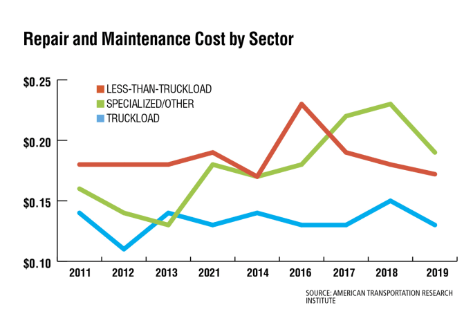 Repair and maintenance costs remained highest for specialized fleets in 2019 at 18.7 cents per mile. Truckload carriers reported the lowest line-item repair cost at 12.8 cents per mile on average, while less-than-truckload carriers reported about 16 cents per mile on average, according to ATRI’s report.