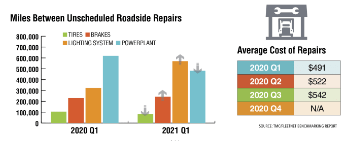 The top components/systems that lead to roadside breakdowns across all the fleets continued to be the lighting system, powerplant, brakes and tires, according to the Technology & Maintenance Council and FleetNet America’s Benchmarking report — the same components that top the list most years.