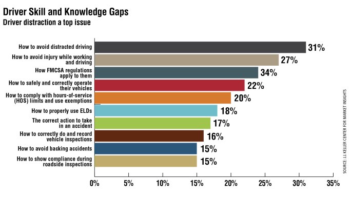 The number one driver knowledge/skill gap identified by fleet managers in a J.J. Keller survey was how to avoid distracted driving, which is also a top carrier issue identified in the American Transportation Research Institute's 2020 Critical Issues in the Trucking Industry report. Some “secondary” skills desired by fleet managers include driving in mountains and inclement weather, how to maintain a healthy lifestyle on the road, and how to know when they are too tired or sick to drive.