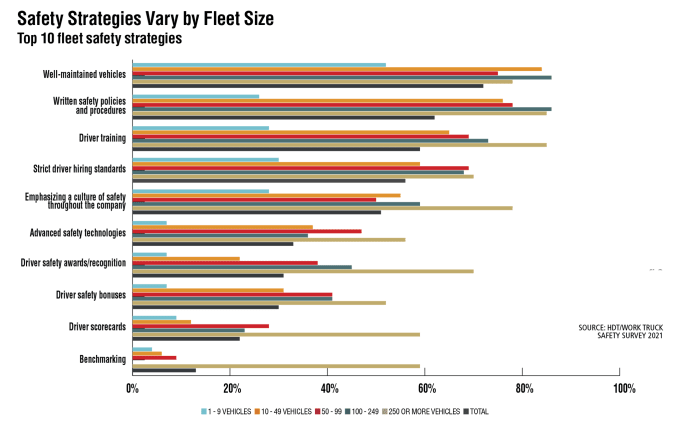 Larger fleets in the HDT/Work Truck 2021 safety survey were more likely to pursue driver training and emphasizing a culture of safety as safety strategies than respondents as a whole.