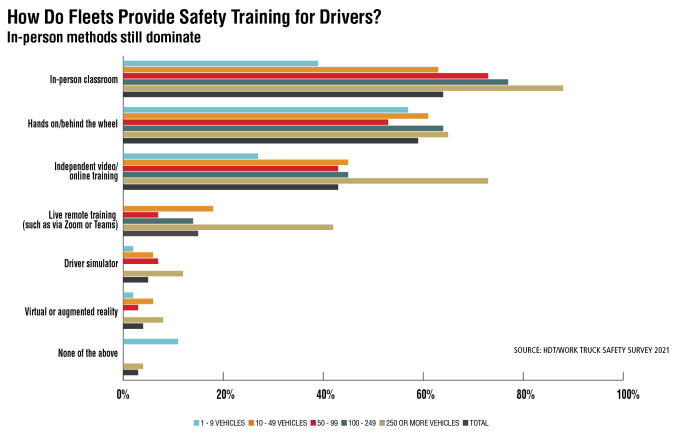 Nearly two-thirds of fleet professionals surveyed do in-person classroom-based driver safety training. Larger fleets are far more likely to do in-person classroom training, as well as more likely to use technology-based training solutions such as independent video/online training, live remote training, driver simulators, and virtual or augmented reality.
