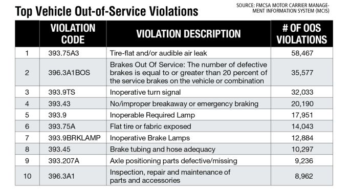Looking at FMCSA’s top out-of-service equipment violations for fiscal year 2021 to date (as of mid-July), “Inoperative Brake Lamps” appeared in the top 10 list this year but not last year, perhaps because of CVSA’s Roadcheck focusing on lighting. Load securement, which was no. 8 last year, dropped out of the top 10 this year, with “Leaking/spilling/blowing/falling cargo” appearing at number 11.