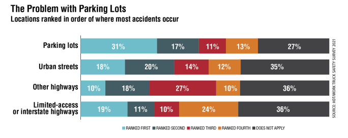 Parking lots appear to be more of a challenge for fleet respondents than other locations, with nearly half ranking it first or second when asked where the most accidents occur.