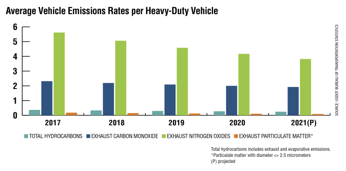 The average emissions rates per heavy-duty vehicle has steadily declined since 2005, according to the U.S. Department of Transportation’s Bureau of Transportation Statistics. BTS defines heavy-duty vehicles as those with more than two axles or four tires.