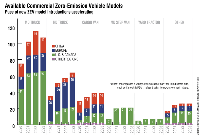 The overall number of available zero-emission commercial vehicle models is on a strong upward trajectory globally despite the economic impacts of the global pandemic, according to Calstart’s Zero-Emission Technology Inventory. The United States will see an even sharper uptick in available zero-emission heavy-duty truck models compared to other global markets in the next few years, rising 250% from just eight models in 2020 to 28 models on the market in 2023. Last year at this time, only 16 heavy-duty trucks were expected to be available by 2023.