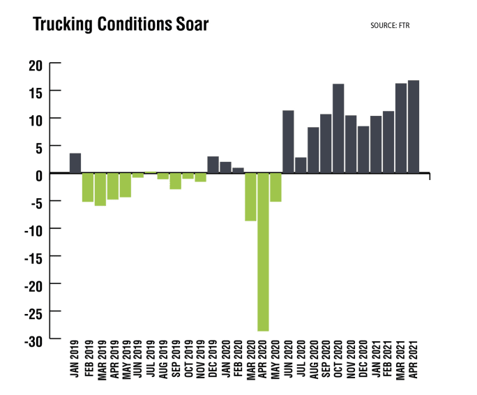 After plummeting during the pandemic lockdown last year, FTR’s Trucking Conditions Index set record highs in March and April, the most recent figures available. The TCI tracks the changes rep-resenting five major conditions in the U.S. truck market: freight volumes, freight rates, fleet capacity, fuel price, and financing. (FTR reported May TCI eased slightly from April's record 16.82 to a still-robust 15.72.)