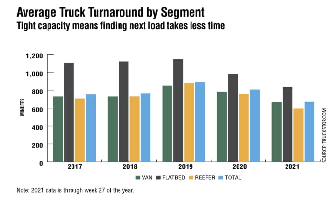 Truck turnaround time data from Truckstop.com measures the time it takes to find a load af-ter offloading at the previous customer. Although 2021 numbers are only through July 11, it’s clear that tight trucking capacity has caused those turnaround numbers to drop, especially in the refrigerated sector, indicating a freight marketplace that heavily favors the carrier. This carrier advantage is being driven by the explosion of load posting volumes in the spot market. At press time, load volumes were more than 100% more than a normal spot market. The truck turnaround time will most likely continue to stay below normal until the spot market returns to balance.