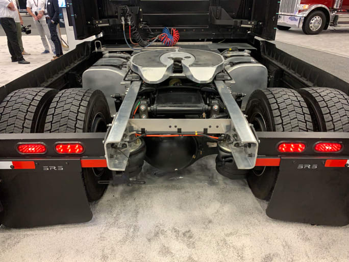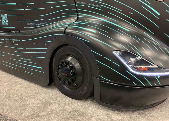The chassis fairings on the truck on display at the show were virtually touching the floor. The full air-ride suspension allows the truck to raise up to 6 inches higher during low-speed maneuvering, while it lowers at highway speeds for optimum aerodynamics. And, engineers said, the fairings are designed to be sturdy, with a flexible strip at the bottom.