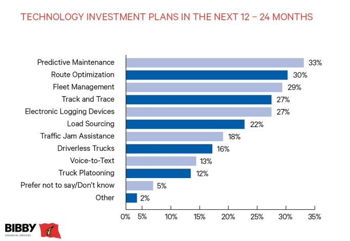 Another common component of new technology platforms was a focus on helping to reduce business costs by staying on top of key administrative tasks. The BFS US Trucking Trends Survey showed predictive maintenance platforms as the most demanded upgrade, with one in three trucking companies looking to add them in the next two years.