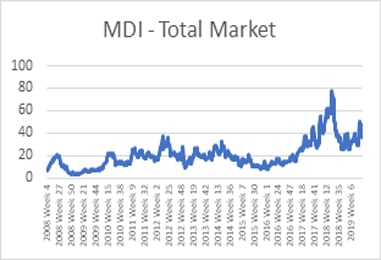 In the next chart, you can see the data from the Truckstop.com MDI measurement (loads posted/trucks posted).