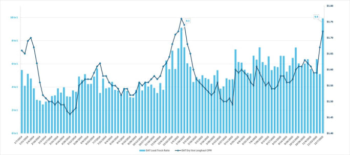 DAT tracked a spike in freight rates the week after Thanksgiving.