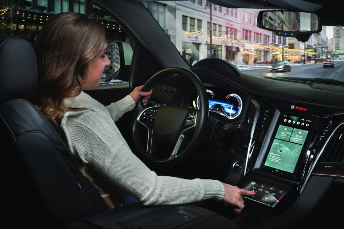 Connectivity can improve the driving experience by using multiple displays and electronics run from a single electronic control unit. The system implements smart, multimodal human machine interface including voice print, smart voice recognition, driver identification and a haptic control panel to make the vehicle increasingly driver-centric. Photo: Bosch