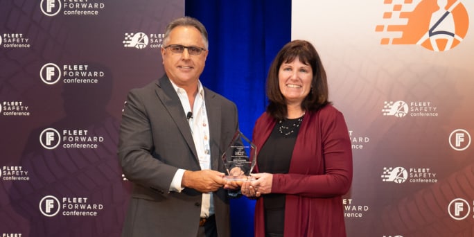 Carol Heinowski accepted HDT's 2022 Safety & Compliance Award from J.J. Keller's Glen Hayes at the Fleet Safety Conference.