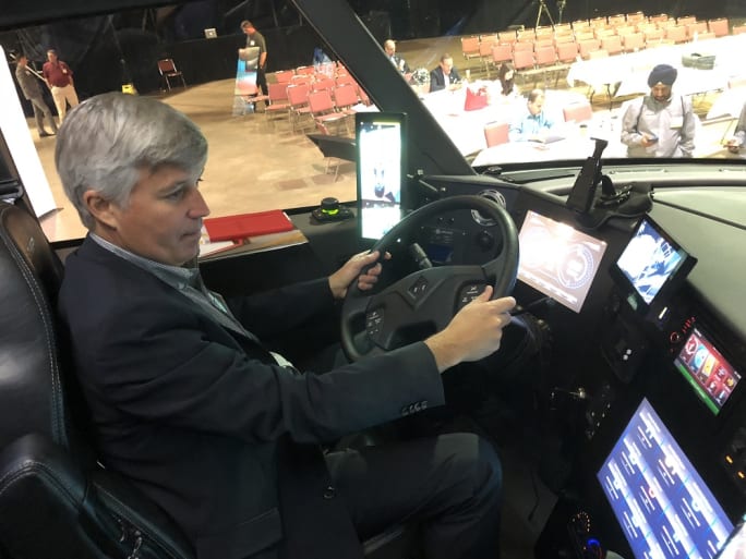 Carlos Maurer, president of Shell Lubricants Americas, sits at the wheel of the Starship truck during a press event in Jacksonville, Florida.