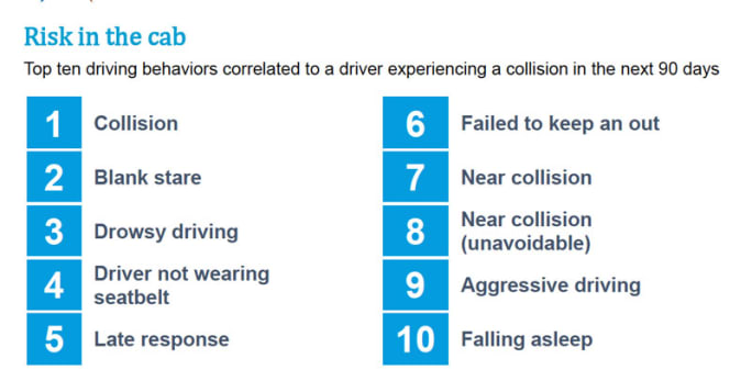Using human-reviewed data, Lytx said, it is able to identify correlations between specific risky driving behaviors and the likelihood of those behaviors resulting in a collision. The top 10 driving behaviors it found were correlated to a driver experiencing a collision in the next 90 days were: