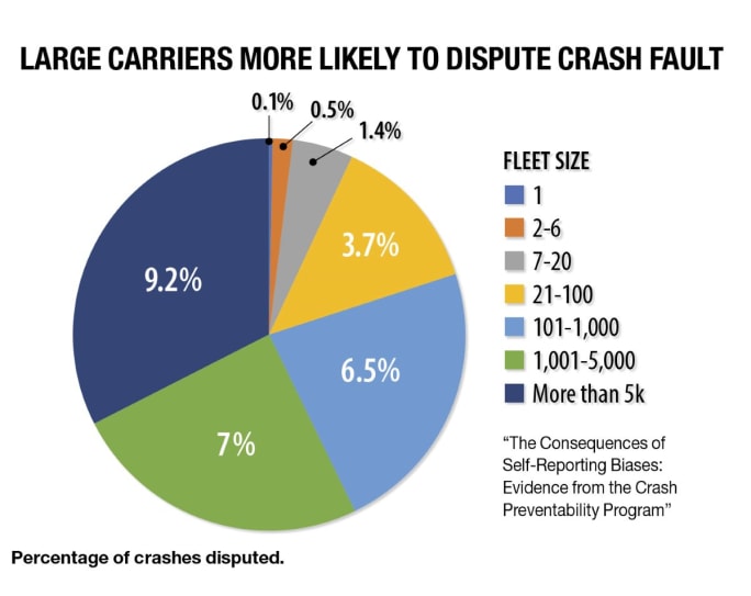 In the data examined by the researchers, motor carriers with one truck disputed 23 of the 15,935 accidents they were involved in (0.1%). In contrast, carriers with more than 5,000 trucks disputed 763 of their 8,291 accidents (9.2%). In other words, the largest carriers were more than 63 times more likely to dispute an accident than a single-truck carrier. Large carriers also were more successful in convincing the FMCSA that they were not responsible for the accident.