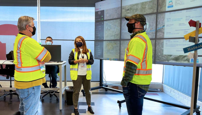 HDT Senior Contributing Editor Jack Roberts (left) tours the Torc Robotics Mission Control Center in its Albuquerque, New Mexico, autonomous truck testing facility with Klara Oberhollenzer and Andrew Culhane.
