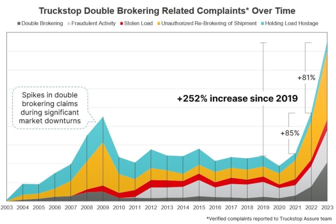 Truckstop dug into its historical data and found the last time a similar surge in complaints happened was in 2008 and 2009, when there was a recession and the marketplace moved from a good, normal market to a depressed marketplace for about nine months. During that time, fraudulent activity increased dramatically, but still not as much as it has in 2023.