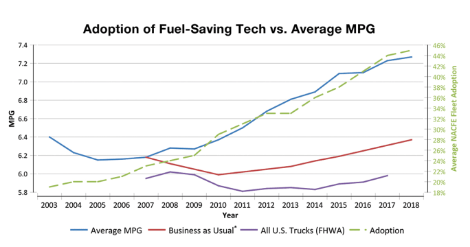 Fleets look at a number of factors when determining whether to invest in a technology that will improve fuel efficiency. While specific technology adoption varies by duty cycle, business model, and other factors, fleets are continuing to invest in fuel-efficiency technologies.