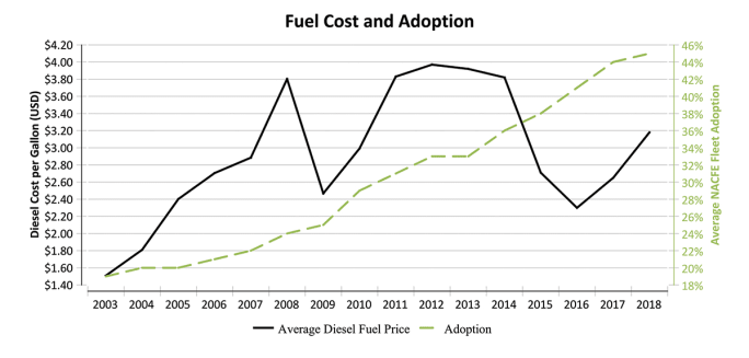 The efficiency-minded fleets in NACFE’s Annual Fleet Fuel Study have steadily increased their adoption of fuel-saving technologies – even as fuel prices have varied widely.