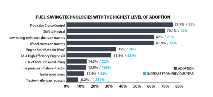 Among the technologies that showed the biggest increases in the 2018 study were tractor gap reducers, high-efficiency engine oil (FA-4), tractor solar panels, predictive cruise control, and tractor wheel covers.