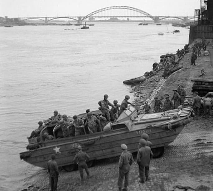 A DUKW brings supplies across the Waal River in Holland durng Operation Market Garden in 1944.