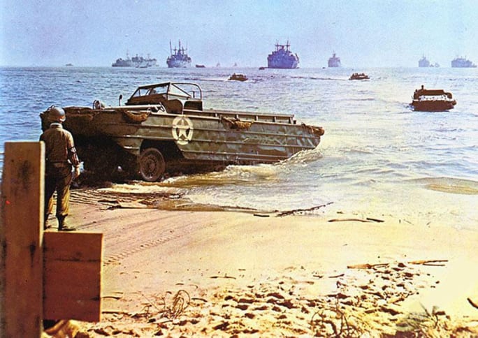A GMC DUKW wades ashore during Operation Dragoon in Southern France in the summer of 1944.