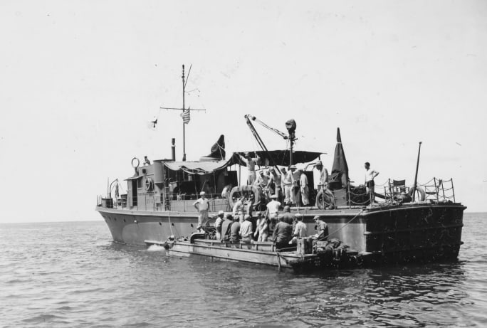 Wounded GIs being transferred to a waiting ship from a DUKW during the Battle for Mindinao during the Phillippines Campaign in 1945.