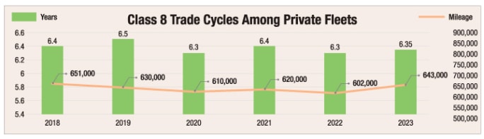 As measured by mileage, trade cycles increased to 643,000 miles, which is 43,000 miles more than last year’s replacement cycles of 620,000 miles for the average Class 8 tractor.