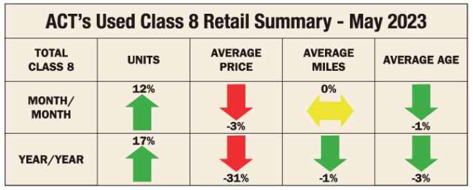According to ACT Research, used Class 8 retail volumes (same-dealer sales) improved by 12% in May from the previous month. Sales usually slow 4%-5% in May, so the increase was not only uncharacteristic, but also presents a bit of a conundrum in the context of the current economic and freight environments. As owner-operators and smaller fleets in particular exit the industry, inventory continues to increase. This is providing remaining fleets with more options than they have had in a long time, ACT analysts explained.