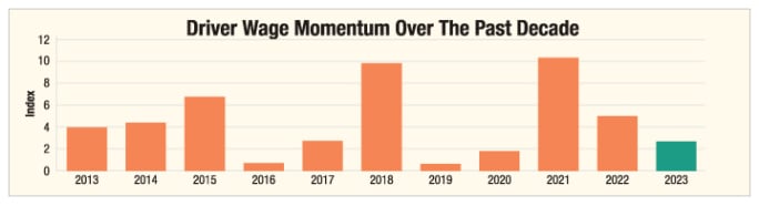 After the longer economic recovery period following the Great Recession, driver pay momentum has been in a yo-yo cycle, with large upward momentum in 2018 and 2021 followed by years with muted changes to driver wages.